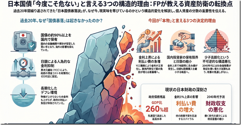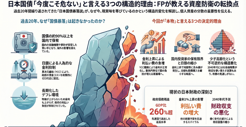 「日本国債が危ない」という警告は、過去20年間、何度も外れてきました。しかし今回は、金利上昇・財政悪化・国内投資家の限界・円安インフレ・少子高齢化という5つの要因が同時に進行しており、構造的に過去とは異なる状況です。