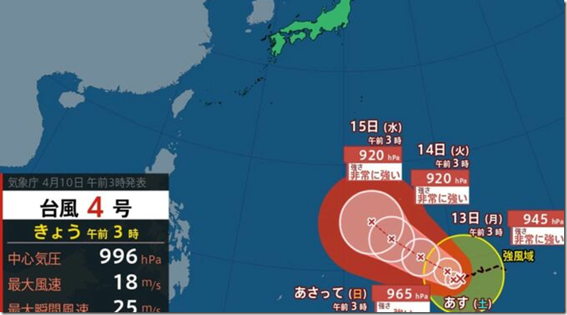 台風4号は、10日午前3時にはトラック諸島近海にあって、1時間に20キロの速さで西へ進んでいます。