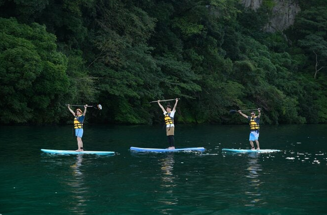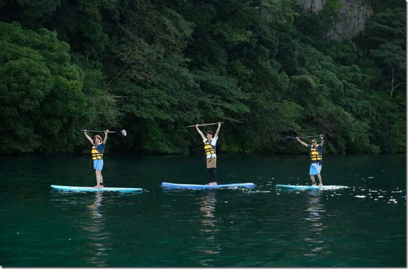 モーターボートでSUPができるポイントまで運んでくれるのだが、パワースポット「黄金の鳥居」の近くを通ったり、鋭い岩が折り重なるような「剣岩」を鑑賞したり、移動しながら湖畔にある見どころを案内してくれる。また、2つの岩が並んだ「夫婦岩」は子孫繁栄や夫婦円満などのパワースポットだというが、岩が欠け、その岩肌が龍の顔に見えるようになったのだとか。
