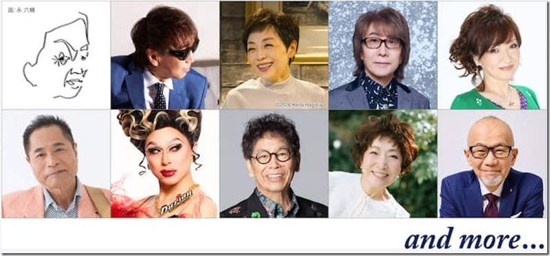 きたやまをはじめ、THE ALFEEの坂崎幸之助(71)、清水ミチコ(66)、杉田二郎(79)、クミコ(71)、南こうせつ(77)、森山良子(78)ら同公演のおなじみの顔ぶれがずらり。