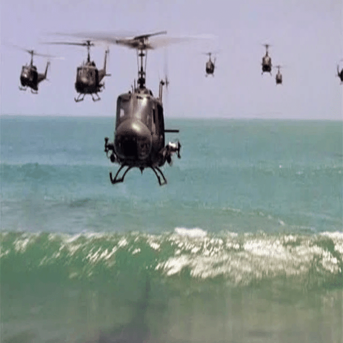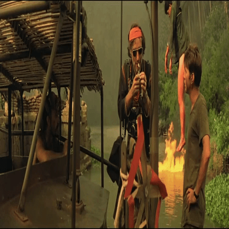 (有名なベトコン村の襲撃シーン。ここでかかる曲ワーグナーの「ワルキューレの騎行」は、映画のBGMというだけではなく、キルゴアがベトコンを威嚇するためにヘリから大音量で流させるという劇中のものでもある)