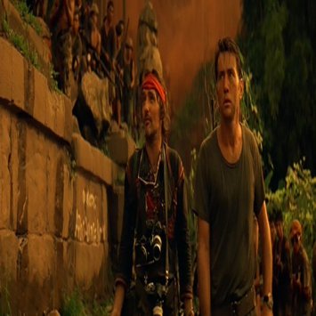 (カーツの独立王国にたどり着いたウィラードを迎えたのは、王国に住み着いたというアメリカ人報道写真家。彼が王国内を案内するが、ところどころに死体が吊されたり(上の写真)転がったりしている)