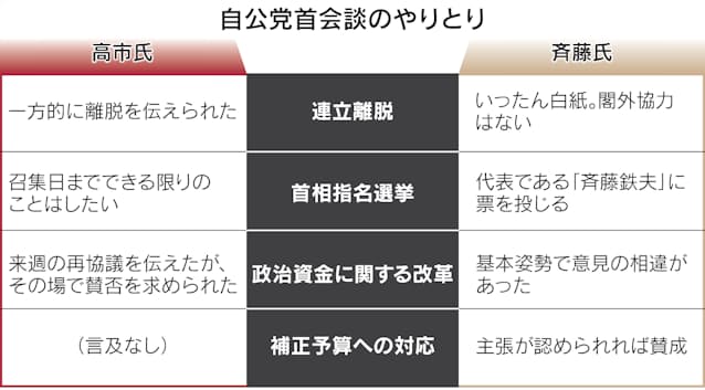 高市氏は会談後、記者団に「一方的に連立離脱を伝えられた。大変残念だ」と説明した。