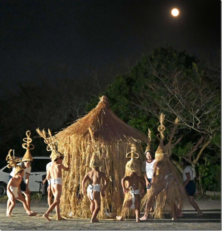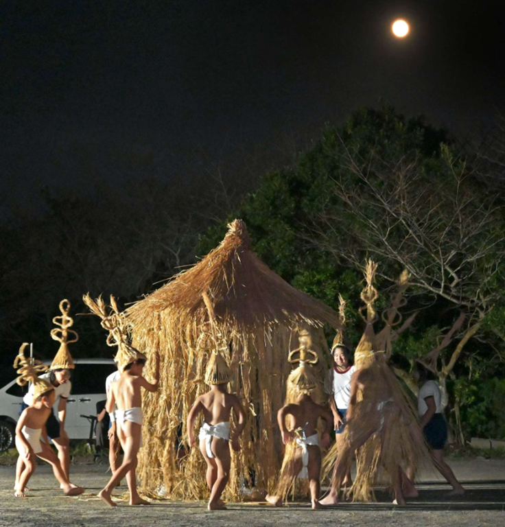 国の重要無形民俗文化財「南薩摩の十五夜行事」の一つ「ソラヨイ」が6日夜、鹿児島県南九州市知覧であった。中福良地区では、少子化により今年から女子の踊り手も本格参加。中秋の名月の下、稲わらで作った帽子をかぶって踊り、収穫への感謝と豊作を祈った。