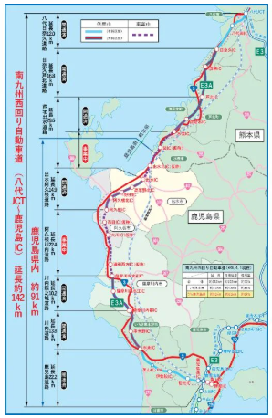 このうち熊本県と鹿児島県にかけては延長約140kmの国道3号高規格バイパス「南九州西回り自動車道」が整備されています。一部区間がブツ切れ状態となっていますが、内陸側を進む九州道からは八代JCTで分かれ、西の海側を通って、ちょうど国道3号現道に沿い鹿児島市内に至るかたちです。