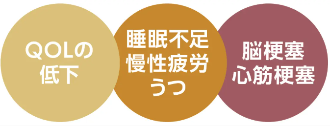 睡眠不足から慢性疲労やうつ、イライラの原因になり、生活の質(QOL)が低下します。また脳梗塞や心筋梗塞などの重篤な病気の引き金になることも