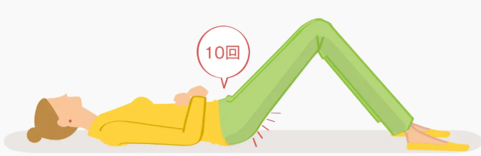両足を肩幅くらいに開いて横になり、両膝を立て、尿道、肛門、腟を意識して締めます。これをゆっくり行い3秒キープして緩めます。10回1セットで、1日3セット行います。