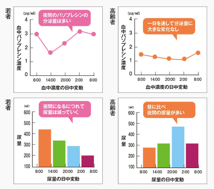 夜間多尿の原因のひとつが抗利尿ホルモン(バソプレシン)の減少です。若い頃は多いので夜間の尿量は減りますが、高齢になると減少するので多尿傾向に