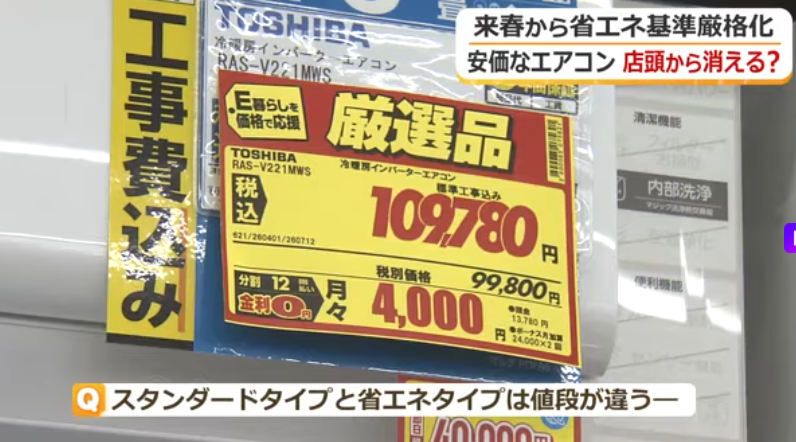 6畳用のエアコンで比べてみると、省エネ基準を満たさないものは約11万円。一方で、来年4月以降の基準を満たすものは約30万円です。