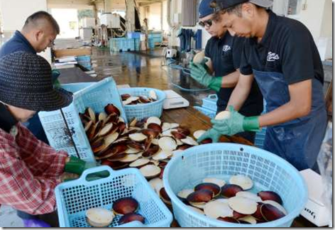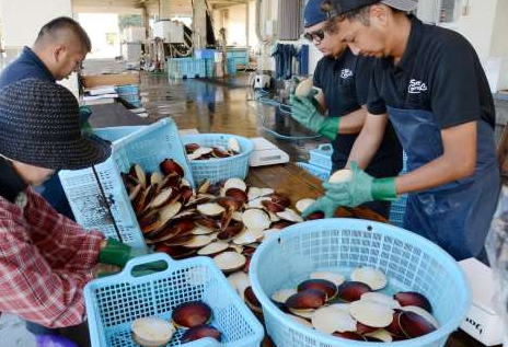 鹿児島県日置市東市来の江口漁協は1日、ツキヒガイ(月日貝)の底引き網漁を解禁、日の出を待って7隻が操業した。淡いクリーム色と深紅色の殻を月と太陽に見立てた二枚貝で、濃厚な味わい。近くの江口蓬莱館で販売しており、漁協職員らが手際よくサイズ別に仕分けて計量した。