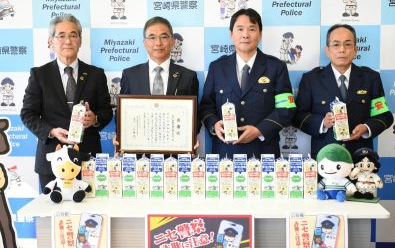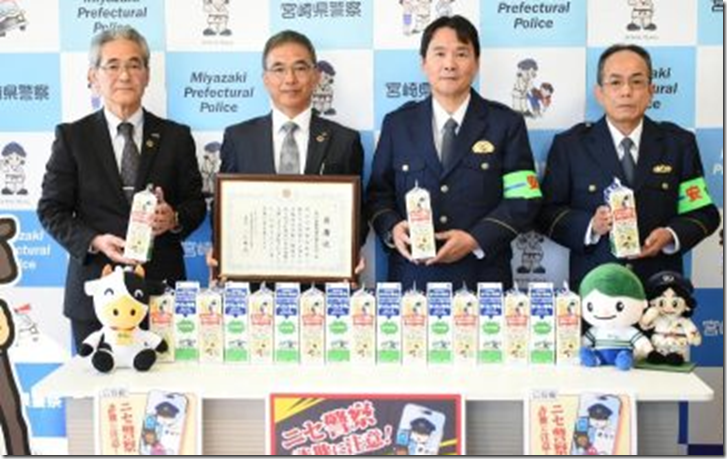 詐欺を牛乳で注意 南日本酪農(都城市)啓発パッケージで県警が感謝状 2025.12.22 特殊詐欺の啓発メッセージが掲載された牛乳パックの販売で、感謝状を受け取った南日本酪農協同の百丸俊昭社長(右から3人目)=16日午後、宮崎市・県警本部 南日本酪農協同(都城市)は16日、同社が販売する1リットル牛乳のパッケージに特殊詐欺被害を未然に防ぐためのメッセージを掲載する啓発活動を始めた。近年増加する「ニセ警察詐欺」の特徴などを紹介し、被害減少を狙う。同日出荷分から約60万本を、宮崎、鹿児島県のスーパーなどで約1カ月にわたって販売する。