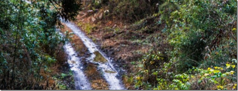 大隅松山駅からは、志布志線は県道110号線に沿うようにさらに山の中へと入ってゆく。ただし、廃線跡は県道からは少し外れた茂みの中へ。