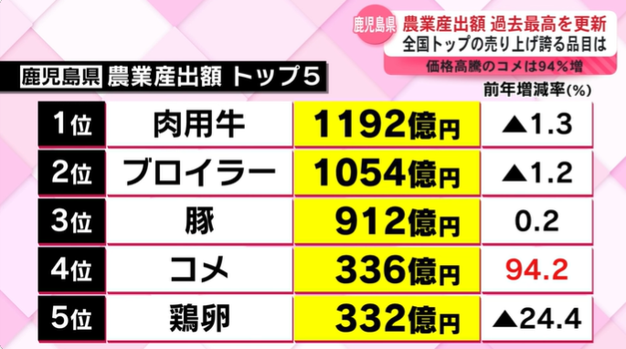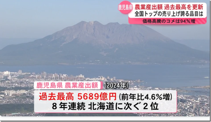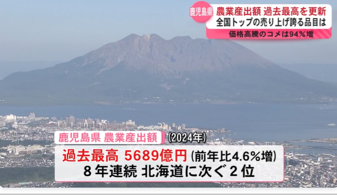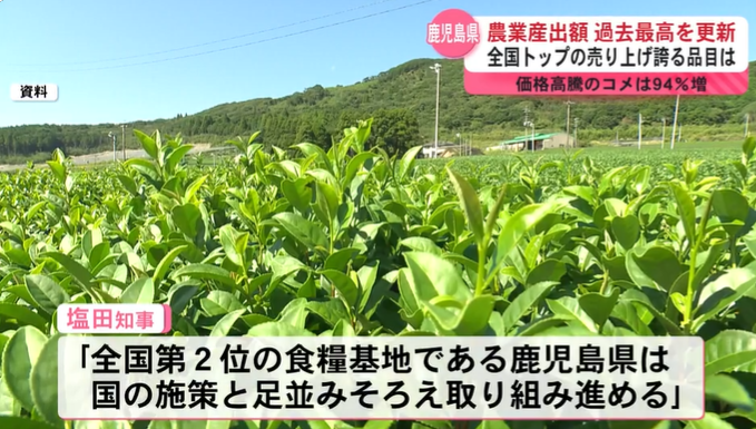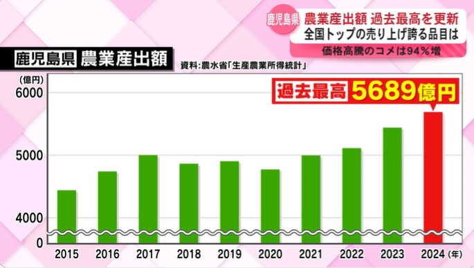 鹿児島県は5689億円で過去最高を更新、8年連続で北海道に続いて全国2位です。鹿児島の農業産出額は一度、落ち込んだものの2020年以降、大きく伸びています。県農政課によるとコメ、野菜の価格が上昇したこと、お茶の需要が増加したことなどが要因だということです。