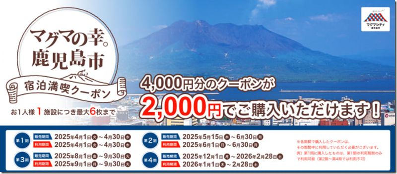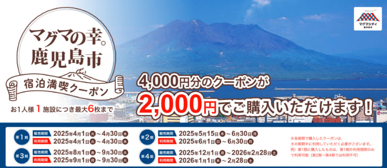 鹿児島市は12月1日、市内の参画宿泊施設で使える割引クーポン「マグマの幸。鹿児島市 宿泊満喫クーポン」第4期の販売を開始した。
