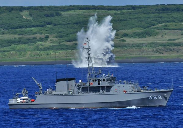 硫黄島の沖合で掃海訓練を行う海上自衛隊の掃海艇「あいしま」(画像:海上自衛隊)。